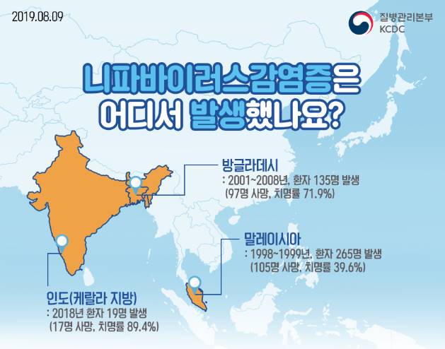 1998년 말레이시아에서 처음 발견되었고, 그 이후 방글라데시, 인도 등 일부 아시아 국가에서 간헐적으로 발생하고 있어요.